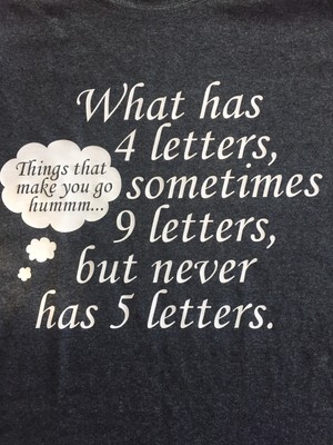 What has 4 letters sometimes 9 but never 5.
